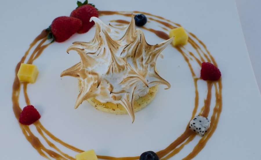 After wetting your whistle, head downstairs to the restaurant – if the weather behaves itself, the terrace is spectacular. Start with the butter-roasted Nova Scotia lobster vol au vent (895 THB, right); the puff pastry is soaked in a sauce that has notes of morel, while the lobster glows with colour and retains its crucial seafood taste.